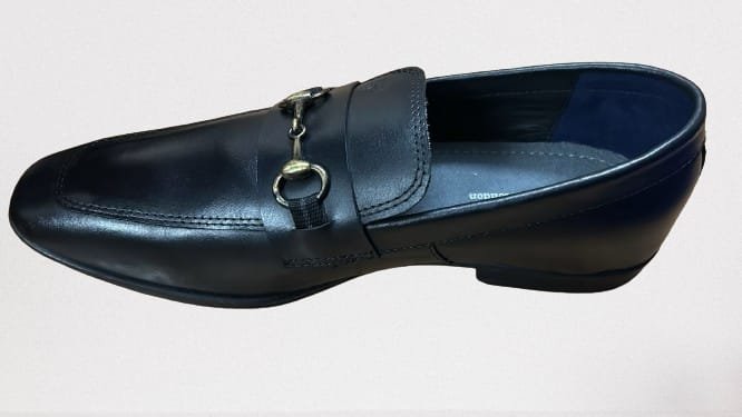 A pair of black solid round-toe formal moccasin has a slip-on closure Leather upper